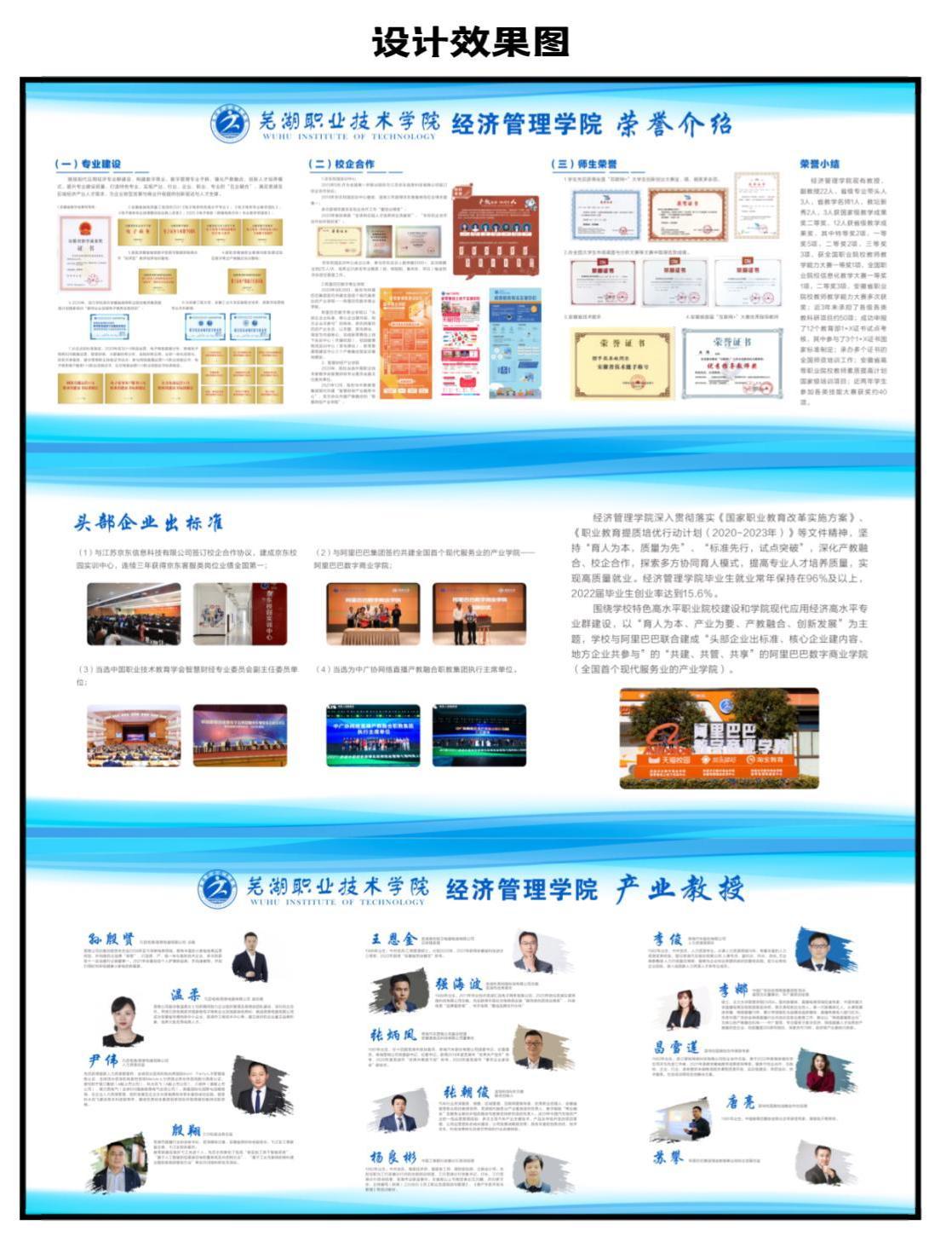 提炼内容,塑造模式,构建产业学院的芜职样板。建设阿里巴巴数字商业学院产业教授介绍栏,依托京东、阿里巴巴生态圈,积极探索校企师资互动交流机制,共同打造特色高水平师资团队。建设阿里巴巴数字商业学院文化长廊,从“头部企业出标准、核心企业建内容,地方企业共参与”三个方面介绍产业学院建设历程及取得的成效,构建产业学院的芜职样板。