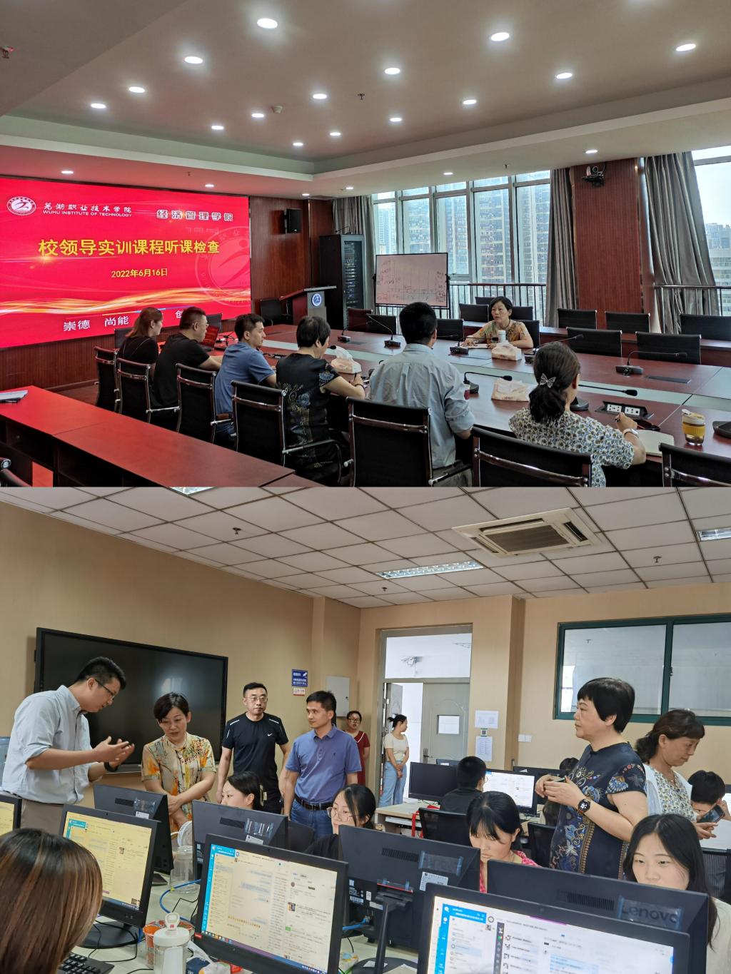 6月16日下午,芜湖职业技术学院副校长刘育红到经济管理学院指导产教融合实训课程的工作,学院党支部书记章景萍、院长王伟、副书记洪俊国、副院长孙文蓉等领导班子陪同。