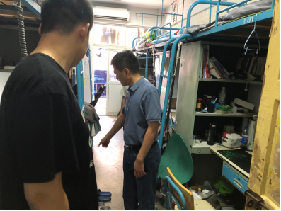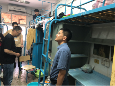 在走访学生寝室时,洪俊国书记询问道:“同学们对住宿条件满意吗?有什么问题都可以提出来,学院都会帮你们解决!”走进宿舍老师们主动关心同学们日常生活的状况和细节,叮嘱同学们注意寝室安全卫生问题,合理安排好期末复习,并提醒同学们暑期离校前切记断水断电,关好门窗。