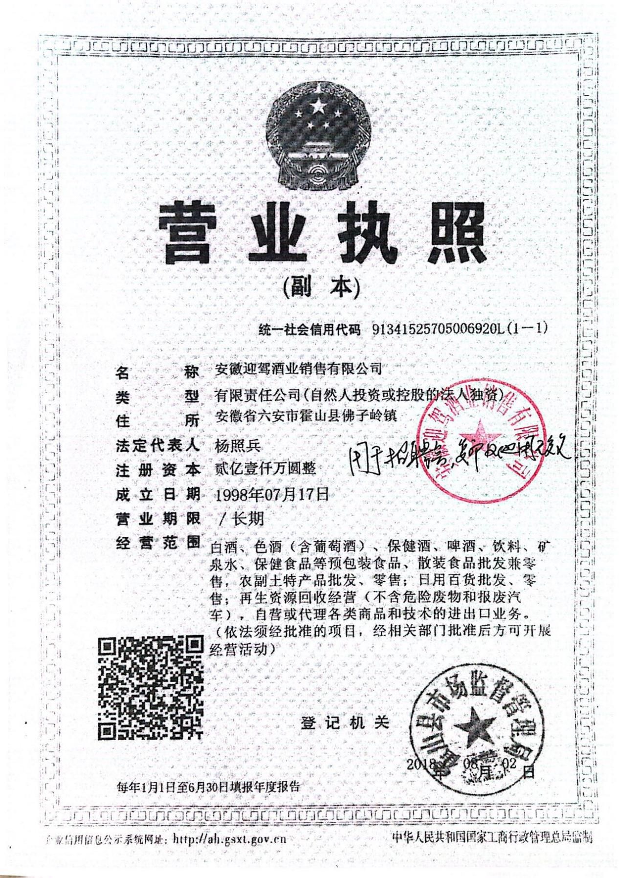 安徽迎驾酒业销售有限公司系安徽迎驾贡酒股份有限公司的全资子公司,坐落于世界美酒特色产区、全国“绿水青山就是金山银山”实践创新基地、中国好水县、中国天然氧吧、中国竹子之乡——安徽省六安市霍山县。公司成立于1998年7月,注册资金2.1亿元,现有员工一千余人。公司主营全系列迎驾贡酒,销售网络遍布全国各地。通过公司多年的专业化运作,迎驾贡酒已走进千家万户,是消费者心目中健康好喝的酒、国人的迎宾酒,成为中国生态白酒领军品牌!