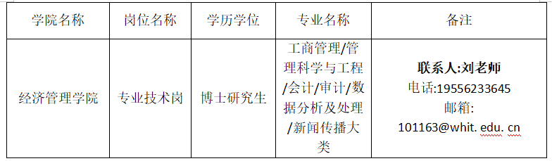 有意向的高层次人员可与学院联系人直接联系,或将个人简历和相关证书扫描件发送至学院邮箱101163@whit.edu.cn,发送邮件主题格式:姓名+应聘专业+学历学位或职称。