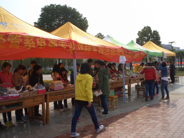 2013年3月25日上午,南校区的校园里出现了一道五颜六色的风景线,一群同学正热火朝天地布置自己的摊位,这是经济管理系12级电子商务1、2班的同学们在进行《网络营销》课程实践活动。本次活动得到了芜湖佳雨商贸公司(创办人:08级电商强海波)、芜湖斯伊商贸公司(创办人:08级电商李瑞)、芜湖佳盈商贸公司(创办人:08级电商王鹏松)三家电子商务专业学长们创办的企业的鼎力支持。