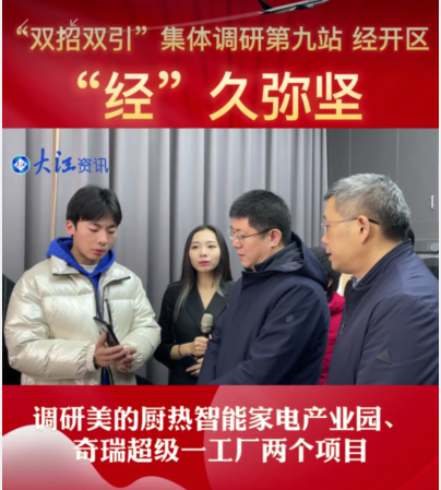 2月10日上午,调研团队来到第九站经开区调研美的厨热智能家电产业园。当调研团队来到产业园的COLMO品牌京东自营直播间调研时,我校2019级电商创业班的肖尚鹏同学负责了调研接待。肖尚鹏同学与单书记在直播带货的直播方式、直播流量和销售运营等多个方面进行了沟通,他详细介绍了多机位直播方式,多角度进行直播,并现场演示了虚拟直播。单书记特地问了直播间最多一天能卖多少,肖尚鹏同学介绍道双十一期间COLMO品牌销售额达1500万元,得到了单书记的夸赞。