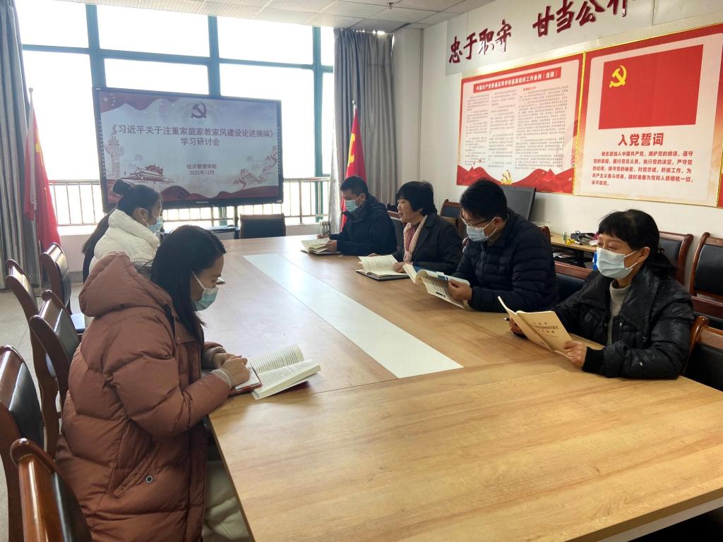 经济管理学院通过开展学习《习近平关于注重家庭家教家风建设论述摘编》系列活动,增强学院党员干部遵规守纪意识,以家风带政风、以家训促廉洁,积极建功职教本科创建。(文、图/杨晓晨 审/章景萍)