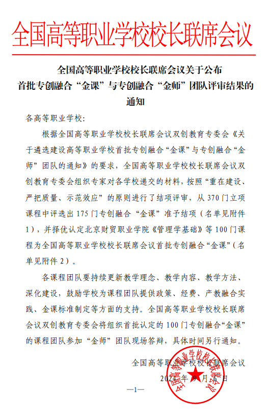 据悉,全国高等职业学校校长联席会议双创教育专委会对各学校370门递交的课程建设材料和资源进行评审,评选出175门专创融合“金课”准予结项,并择优认定100门课程为全国高等职业学校校长联席会议首批专创融合“金课”。