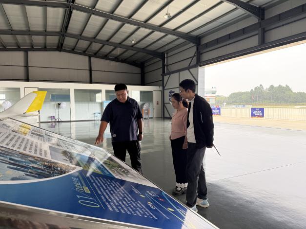 在新媒体运营负责人张云胜的陪同下,俞荟副院长一行人先后参观了飞行营地的实训教学区、模拟飞行体验中心、航空器维修实训车间等核心区域。张云胜详细介绍了营地的发展历程、业务布局、核心优势及人才需求现状,尤其强调当前营地对具备新媒体运营能力、实践操作经验复合型人才的迫切需求。